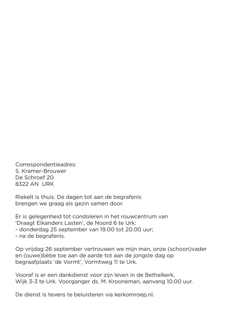 Op vrijdag 26 september vertrouwen we mijn man, onze (schoon)vader en (ouwe)bèbe toe aan de aarde tot aan de jongste dag op begraafplaats ‘de Vormt’, Vormtweg 11 te Urk.