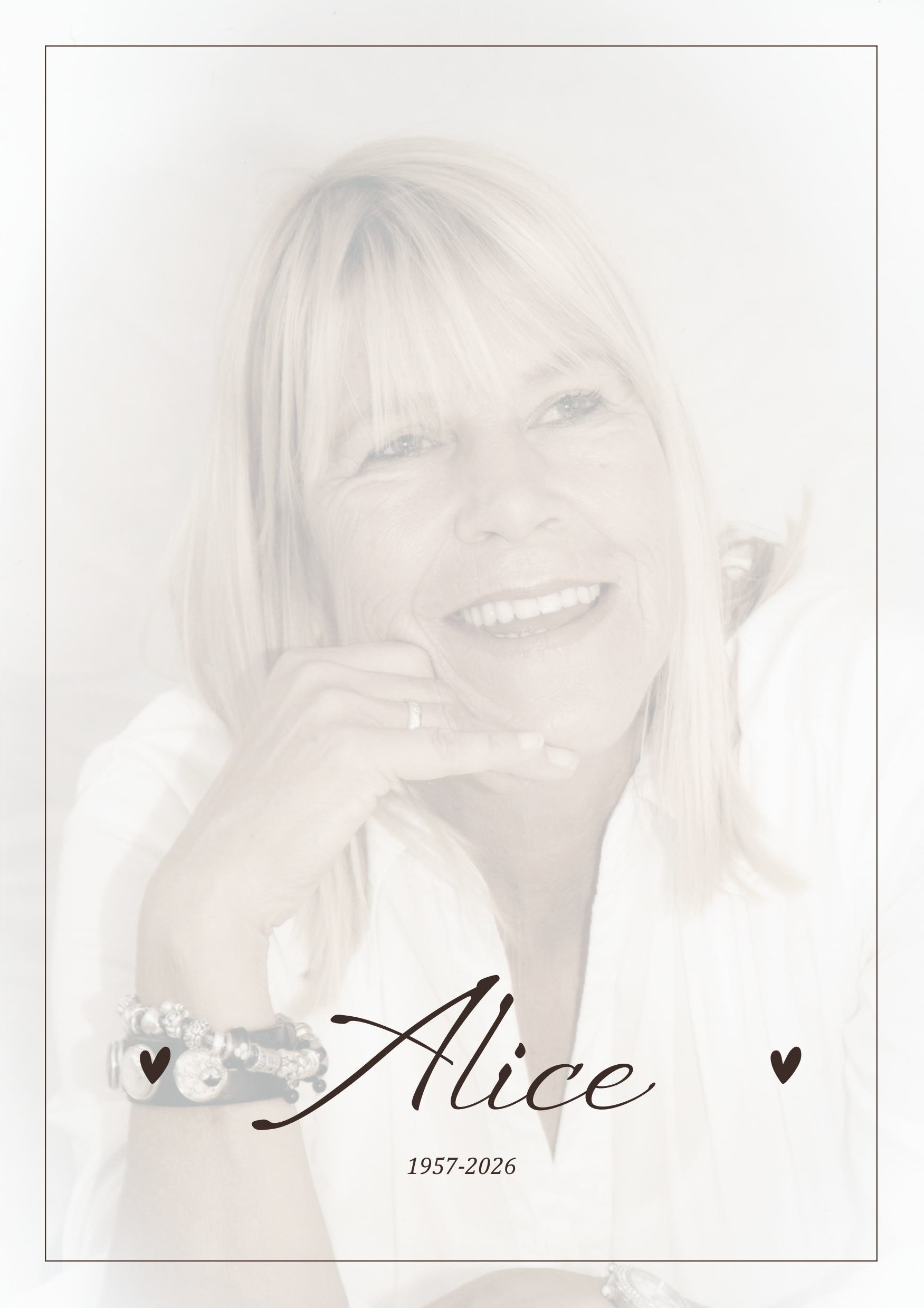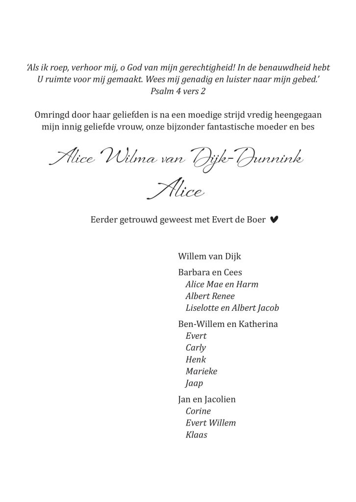 Alice is thuis. Hier bent u dagelijks tussen 16.00 en 18.00 uur welkom om afscheid van haar te nemen.