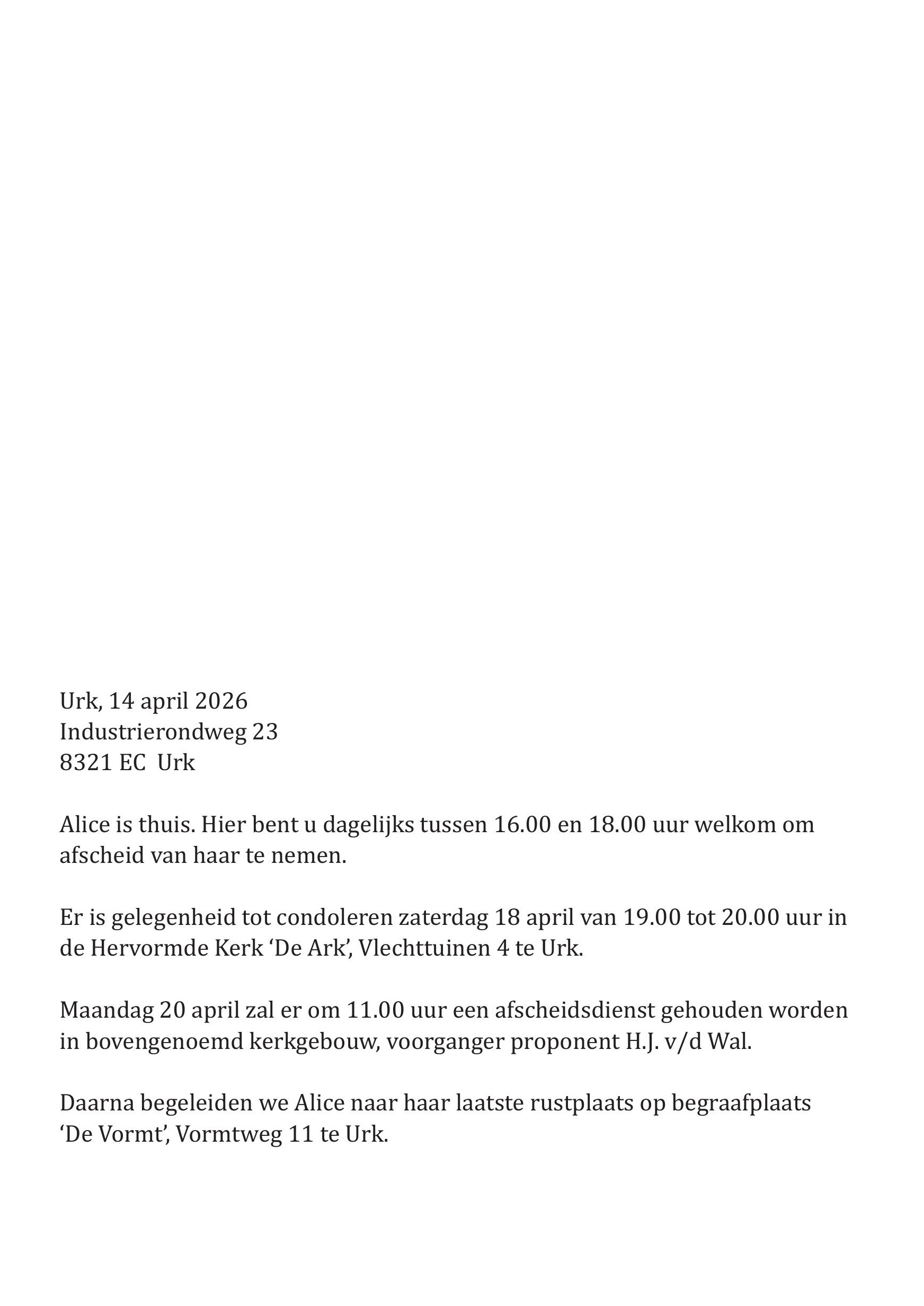 Er is gelegenheid tot condoleren zaterdag 18 april van 19.00 tot 20.00 uur in de Hervormde Kerk ‘De Ark’, Vlechttuinen 4 te Urk.