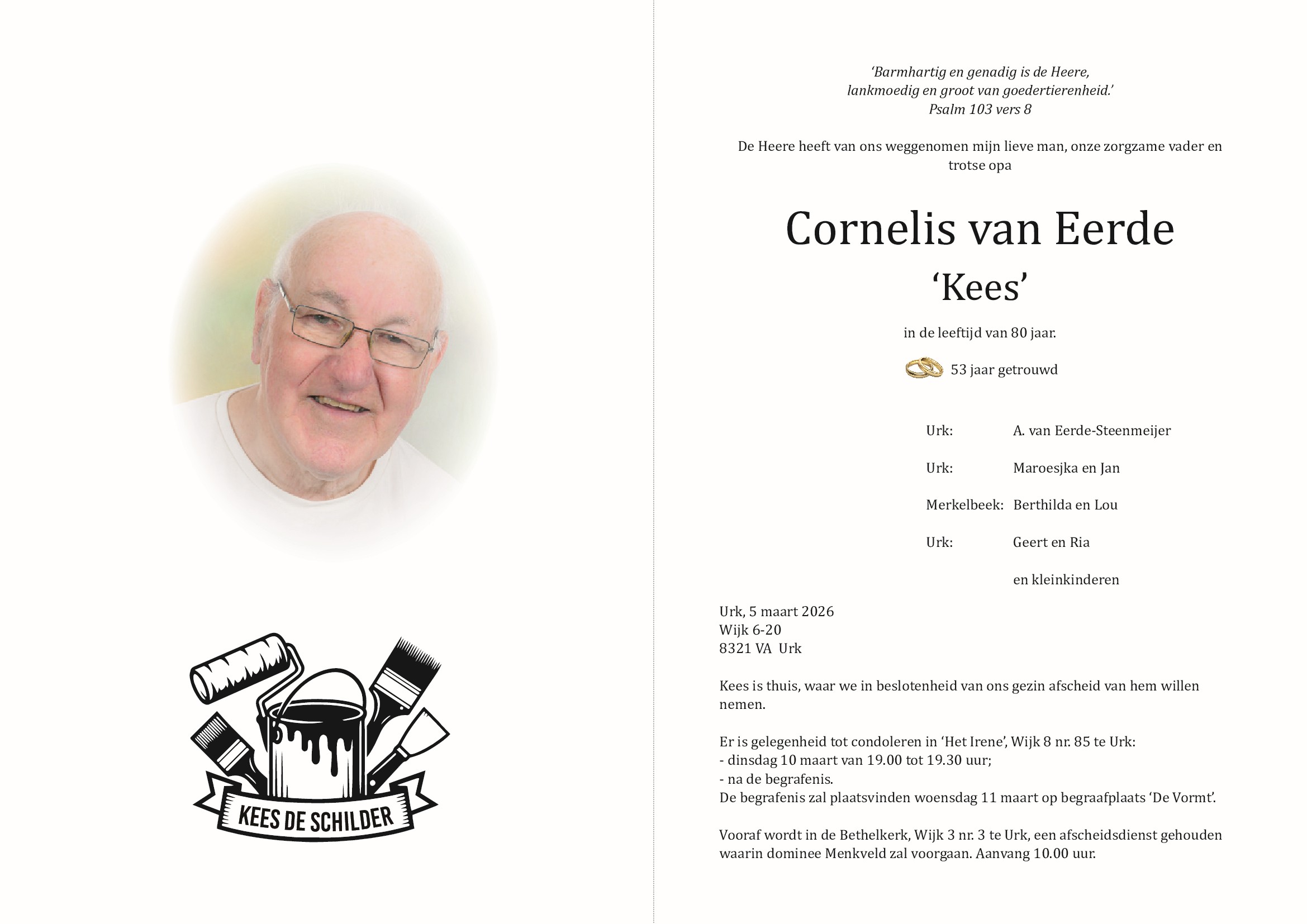 De begrafenis zal plaatsvinden woensdag 11 maart op begraafplaats ‘De Vormt’.