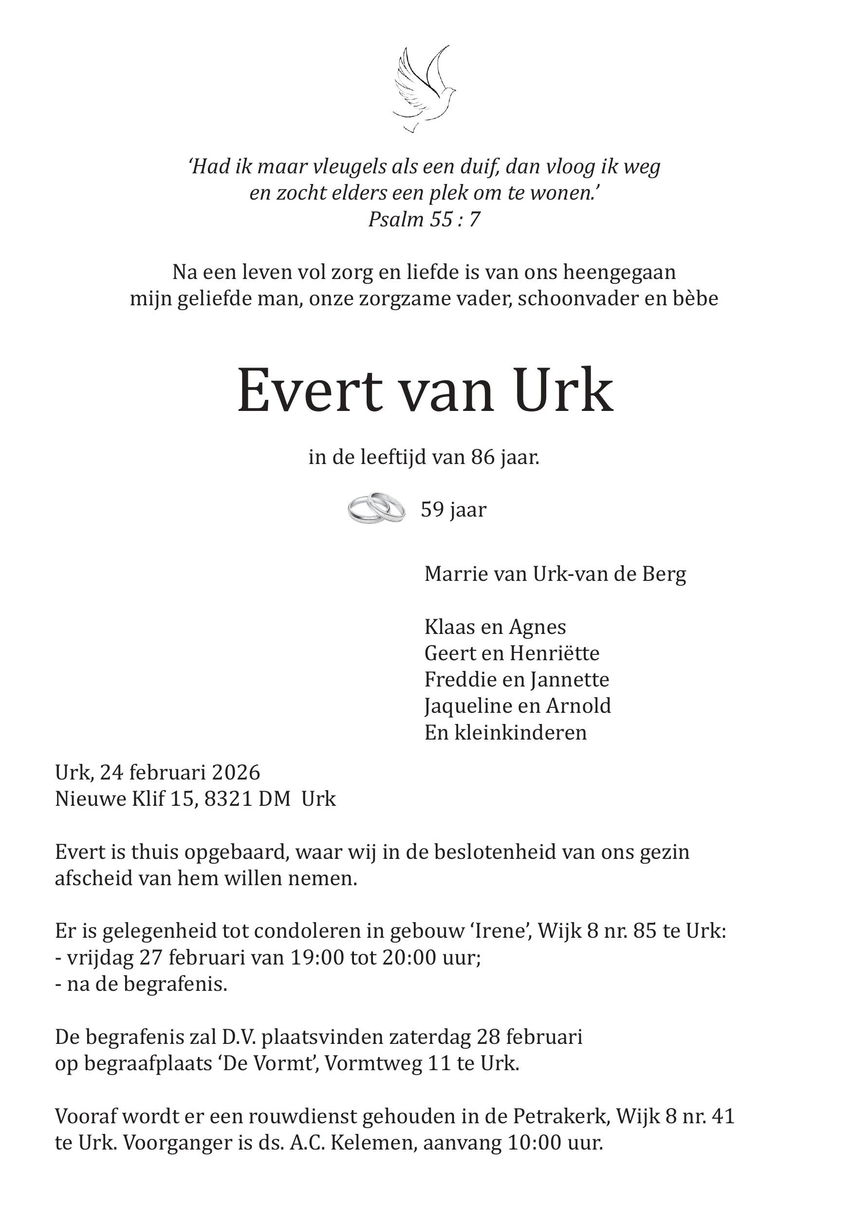 De begrafenis zal D.V. plaatsvinden zaterdag 28 februari op begraafplaats ‘De Vormt’, Vormtweg 11 te Urk. Vooraf wordt er een rouwdienst gehouden in de Petrakerk, Wijk 8 nr. 41 te Urk. Voorganger is ds. A.C. Kelemen, aanvang 10:00 uur.