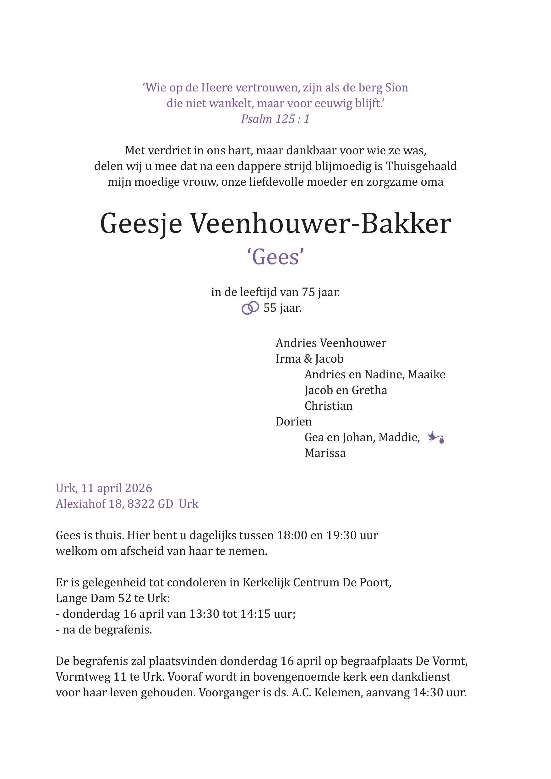 Er is gelegenheid tot condoleren in Kerkelijk Centrum De Poort, Lange Dam 52 te Urk: