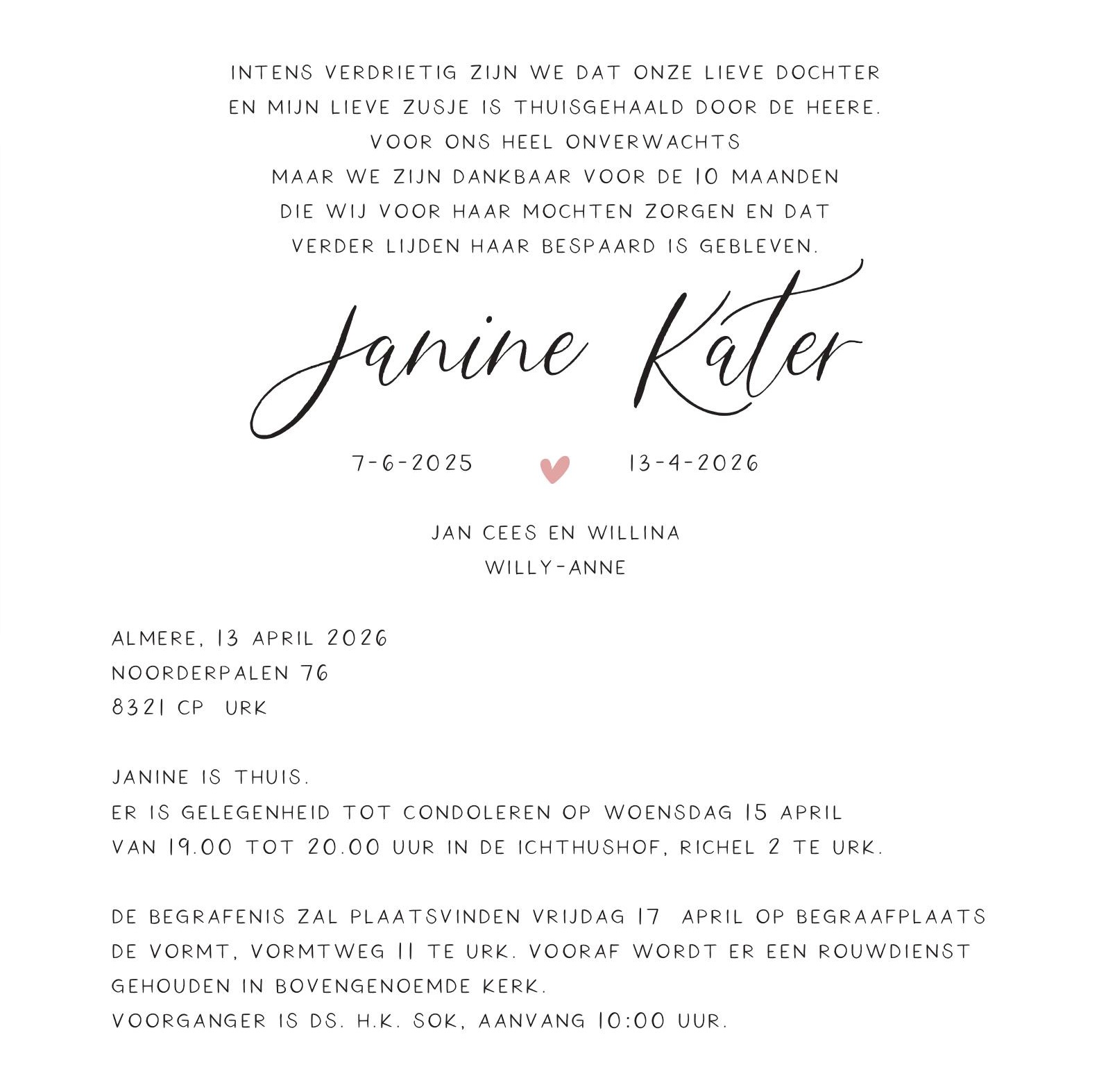 Intens verdrietig zijn we dat onze lieve dochter en mijn lieve zusje is Thuisgehaald door de Heere. Voor ons heel onverwachts maar we zijn dankbaar voor de 10 maanden die wij voor haar mochten zorgen en dat verder lijden haar bespaard is gebleven.